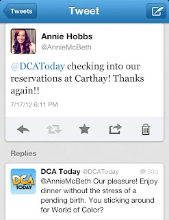 Skipping over to DCA (ok we didn't really skip... well, maybe...), we entered into the lobby of the Carthay Circle Restaurant and gave the hostesses my name. For a brief second, I got that scary panicky feeling my name wouldn't be on the list - that somehow all this really wasn't happening, but DCA Today had done as he said he would and they pulled it right up!